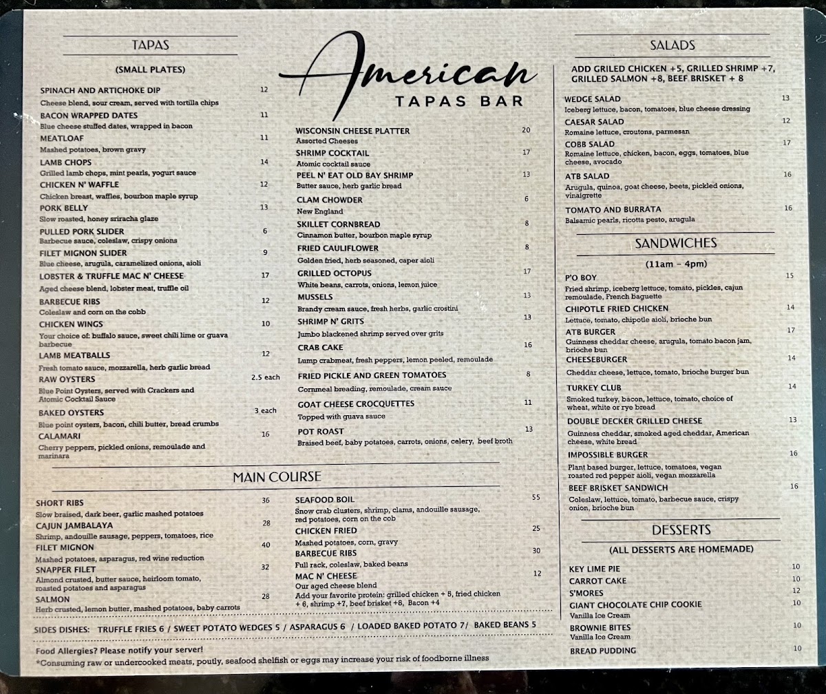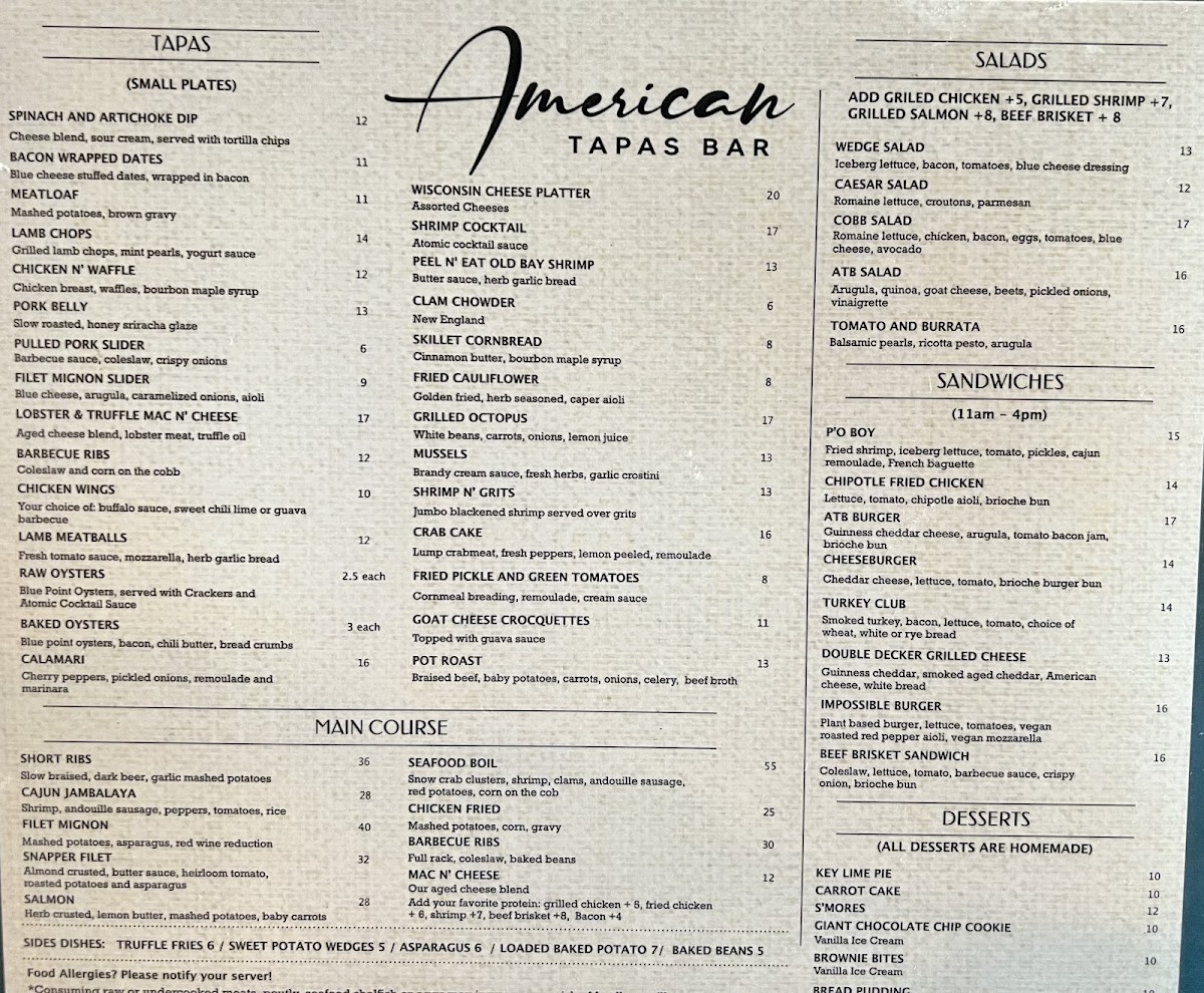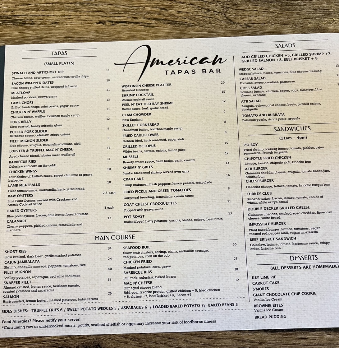 The American Tapas Bar Menu offers a unique twist on traditional tapas, blending bold flavors with fresh ingredients to create an unforgettable dining experience. Located at 2724 E Commercial Blvd, Fort Lauderdale, FL, this cozy spot invites guests to indulge in a variety of small plates that are perfect for sharing. From savory bites like crispy calamari and zesty shrimp cocktails to sweet treats like churros with chocolate dipping sauce, there's something for every palate. The menu focuses on comfort food with a creative flair, offering options for both meat lovers and vegetarians alike. Whether you’re here for a casual bite or a night out with friends, the American Tapas Bar provides a laid-back atmosphere that encourages a fun and social dining experience.